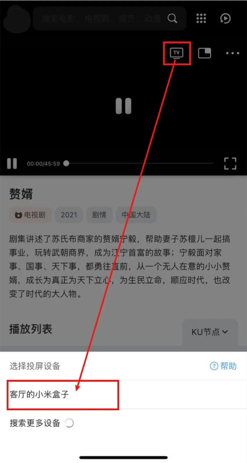 打开QQ浏览器(会接管网页播放器)->打开茶杯狐Cupfox - 努力让找电影变得简单->播放视频->选中投屏图标->等待搜寻出智能电视/电视盒子->选中,即可投屏。